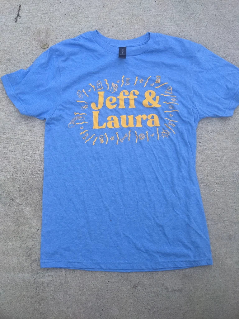 Leftovers from our most recent tour - printed on heather royal blue Gildan Soft Style. Drawings by Jeff and Laura!